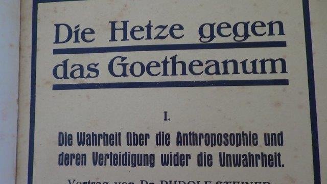 | Meer info: | Die Hetze gegen das Goetheanum. Aktenm?ssige Darstellung. l Verlag des Goetheanum. Dornach 1920. Ln. 106 S. Sehr nett. |