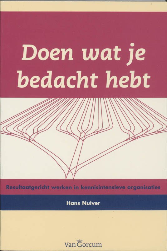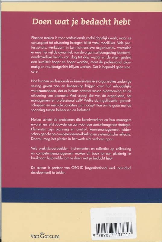 "Plannen maken is voor professionals veelal dagelijks werk, maar ze consequent tot uitvoering brengen blijkt vaak moeilijker. Vele professionals, werkzaam in kennisintensieve organisaties, worstelen er mee. Terwijl de dynamiek van de organisatieomgeving toeneemt, noodzakelijke kennis van dag tot dag wijzigt en de eisen gesteld aan kwaliteit hoger en hoger worden, moet de professional planmatig en resultaatgericht blijven werken. Dat is bepaald geen sinecure.Hoe kunnen professionals in kennisintensieve organisaties zodanige sturing geven aan en beheersing krijgen over hun inhoudelijke werkzaamheden, dat er balans ontstaat tussen planvorming en de uitvoering van plannen? Wat vraagt dat van de organisatie, het management en professional zelf? Welke sturingsfilosofie, gereedschappen en mentale condities zijn nodig? Hoe om te gaan met de spanning tussen beheersen en loslaten?Nuiver schetst de problemen die kenniswerkers en hun managers ervaren en reikt bouwstenen aan voor een samenhangende strategie. Elementen zijn planning en control, kennismanagement, leiderschap gericht op competentieontwikkeling en systematische reflectie. Daarbij mag het plezier in het werk niet verloren gaan. Vele praktijkvoorbeelden, instrumenten en reflecties op zelfsturing en competentiemanagement maken dit boek tot een plezierig en bruikbaar hulpmiddel om te doen wat je bedacht hebt.De auteur is partner van ORG-ID (organisational and individual development) te Leiden."