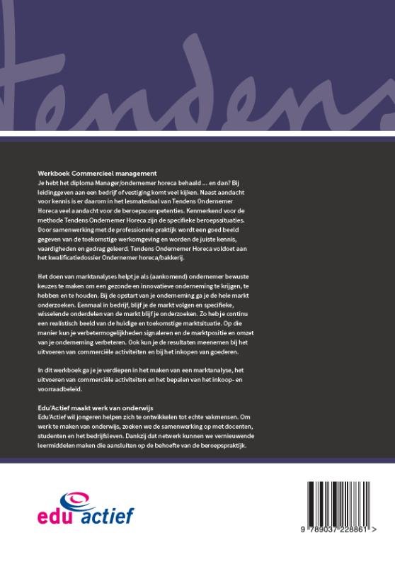 Je hebt het diploma Manager/ondernemer horeca behaald ... en dan? Bij leidinggeven aan een bedrijf of vestiging komt veel kijken. Naast aandacht voor kennis is er daarom in het lesmateriaal van Tendens Ondernemer Horeca veel aandacht voor de beroepscompetenties. Kenmerkend voor de methode Tendens Ondernemer Horeca zijn de specifieke beroepssituaties. Door samenwerking met de professionele praktijk wordt een goed beeld gegeven van de toekomstige werkomgeving en worden de juiste kennis, vaardigheden en gedrag geleerd. Tendens Ondernemer Horeca voldoet aan het kwalificatiedossier Ondernemer horeca/bakkerij.Het doen van marktanalyses helpt je als (aankomend) ondernemer bewuste keuzes te maken om een gezonde en innovatieve onderneming te krijgen, te hebben en te houden. Bij de opstart van je onderneming ga je de hele markt onderzoeken. Eenmaal in bedrijf, blijf je de markt volgen en specifieke, wisselende onderdelen van de markt blijf je onderzoeken. Zo heb je continu een realistisch beeld van de huidige en toekomstige marktsituatie. Op die manier kun je verbetermogelijkheden signaleren en de marktpositie en omzet van je onderneming verbeteren. Ook kun je de resultaten meenemen bij het uitvoeren van commerciële activiteiten en bij het inkopen van goederen.In dit werkboek ga je je verdiepen in het maken van een marktanalyse, het uitvoeren van commerciële activiteiten en het bepalen van het inkoop- en voorraadbeleid.