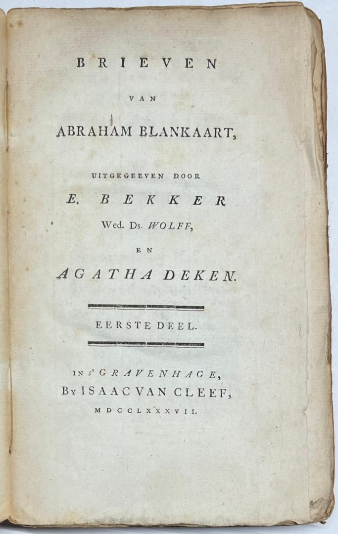 | Titel: | 2 of 3 volumes, 1786, Literature | Brieven van Abraham Blankaart, uitgegeven door E. Bekker, Wed. Ds. Wolff, en Agatha Deken. 's Gravenhage, Isaac van Cleef, 1786, 2 vols. |