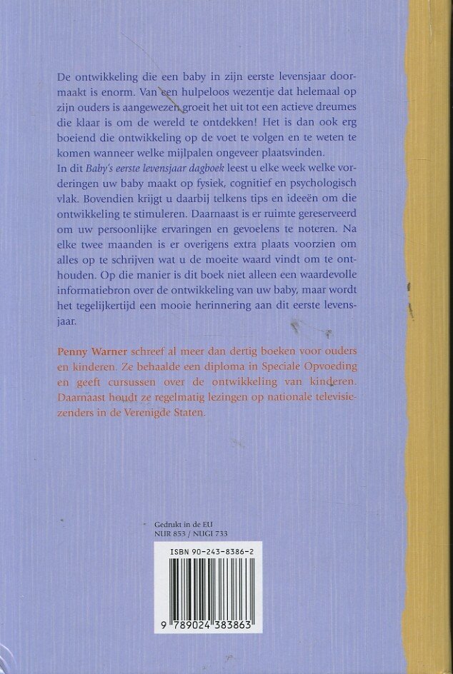 Met duidelijke informatie over de fysieke, intellectuele en emotionele ontwikkeling van uw baby De ontwikkeling die een baby in zijn eerste levensjaar doormaakt is enorm. Van een hulpeloos wezentje dat helemaal op zijn ouders is aangewezen groeit het uit tot een actieve dreumes die klaar is om de wereld te ontdekken! Het is dan ook erg boeiend die ontwikkeling op de voet te volgen en te weten te komen wanneer welke mijlpalen ongeveer plaatsvinden. In dit Baby's eerste levensjaar dagboek leest u elke week welke vorderingen uw baby maakt op fysiek, cognitief en psychologisch vlak. Bovendien krijgt u daarbij telkens tips en ideeën om die ontwikkeling te stimuleren. Daarnaast is er ruimte gereserveerd om uw persoonlijke ervaringen en gevoelens te noteren. Na elke twee maanden is er overigens extra plaats voorzien om alles op te schrijven wat u de moeite waard vindt om te onthouden. Op die manier is dit boek niet alleen een waardevolle informatiebron over de ontwikkeling van uw baby, maar wordt het tegelijkertijd een mooie herinnering aan dit eerste levensjaar. Penny Warner schreef al meer dan dertig boeken voor ouders en kinderen. Ze behaalde een diploma in Speciale Opvoeding en geeft cursussen over de ontwikkeling van kinderen. Daarnaast houdt ze regelmatig lezingen op nationale televisiezenders in de Verenigde Staten.