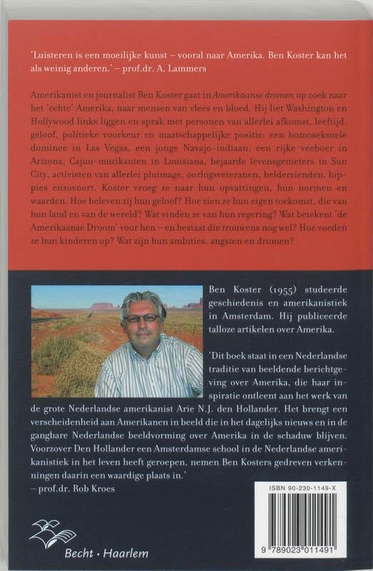 Amerikanist en journalist Ben Koster gaat in Amerikaanse dromen op zoek naar het `echte´ Amerika, naar mensen van vlees en bloed. Hij liet Washington en Hollywood links liggen en sprak met mensen van allerlei afkomst, leeftijd, geloof, politieke voorkeur en maatschappelijke positie. Een homoseksuele dominee in Las Vegas, een jonge Navajo-indiaan, een rijke veeboer in Arizona, Cajun-muzikanten in Louisiana, bejaarde levensgenieters in Sun City, activisten van allerlei pluimage, oorlogsveteranen, winkelbedienden, helderzienden, hippies enzovoort.