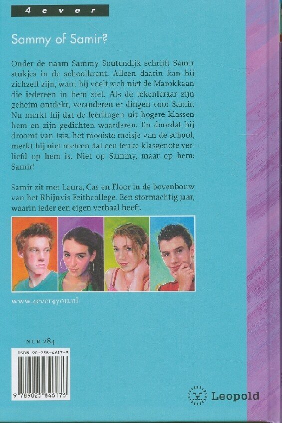 4everSammy of Samir?auteur Lydia Roodomslagillustratie Joyce van Oorschotomslagontwerp Rob GalemaOnder de naam Sammy Soutendijk schrijft Samir stukjes in de schoolkrant van hetRhijnvis Feithcollege. De schoolkrant is de enige plek waar hij zichzelf kan zijn, wantSamir voelt zich niet de Marokkaan die iedereen in hem ziet. Als de tekenleraar zijngeheim ontdekt, veranderen er dingen voor Samir. Nu merkt hij dat de leerlingen uithogere klassen hem en zijn gedichten waarderen. En doordat hij droomt van Isis, hetmooiste meisje van de school, merkt hij niet meteen dat een leuke klasgenote verliefdop hem is. Niet op Sammy, maar op hem: Samir!