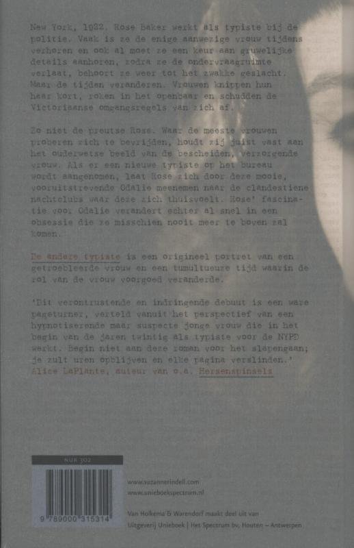 New York, 1922. Rose Baker werkt als typiste bij de politie. Vaak is ze de enige aanwezige vrouw tijdens verhoren en ook al moet ze een keur aan gruwelijke details aanhoren, zodra ze de ondervraagruimte verlaat, behoort ze weer tot het zwakke geslacht. Maar de tijden veranderen. Vrouwen knippen hun haar kort, roken in het openbaar en schudden de Victoriaanse omgangsregels van zich af.Zo niet de preutse Rose. Waar de meeste vrouwen zich proberen te bevrijden, houdt zij juist vast aan het ouderwetse beeld van de bescheiden, verzorgende vrouw. Als er een nieuwe typiste op het bureau, laat Rose zich door deze mooie, vooruitstrevende Odalie meenemen naar de clandestiene nachtclubs waar deze zich thuisvoelt. Rose´ fascinatie voor Odalie verandert achter al snel in een obsessie die ze misschien nooit meer te boven zal komen.De andere typiste is een origineel portret van een getroebleerde vrouw en een tumultueuze tijd waarin de rol van de vrouw voorgoed veranderde.