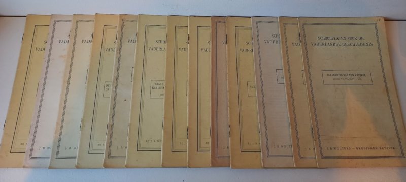 - Belegering van een kasteel (Huis te Voorst, 1362) - Een stad in de Middeleeuwen - In een Middeleeuwes Klooster - Een hagepreek buiten Utrecht (augustus 1666) - Ter Walvisvaart - Op de rede van Bantam, 1598 - Aan de Hollandse Waterlinie, 1672 - Czaar Peter de Groote bezoekt een buitenplaats aan de Vecht, 1717-I (Gezicht op het huis en de rivier) - Hollandse Infanterie bij de bruggen over de Berezina, 1812 - De Prins van Oranje aan het hoofd van de Nationale Militie bij Quatre -Bras, 16 juni 1815 - Stadsleven tegen het midden der 19e eeuw - Voor honderd jaar - Tocht naar Chattam, 1667 In elke handleiding staat de schoolplaat afgedrukt. |