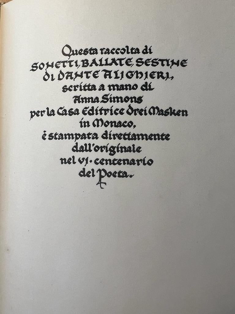 ![Alighieri, Dante, Simons, Anna - Poetry Dante 1921 | Bibliotheca manu scripta, Dante Alighieri, Sonetti Ballate, Sestine, scritta a mano di Anna Simons, Monaco Casa Drei Masken [1921] WITH autograph of Rie Cramer pasted on flyleaf, [34] pp. Alighieri, Dante, Simons, Anna - Poetry Dante 1921 | Bibliotheca manu scripta, Dante Alighieri, Sonetti Ballate, Sestine, scritta a mano di Anna Simons, Monaco Casa Drei Masken [1921] WITH autograph of Rie Cramer pasted on flyleaf, [34] pp.](https://images.boekwinkeltjes.nl/medium/PIAIhaOdAbKrP9c5JLYA.jpeg)