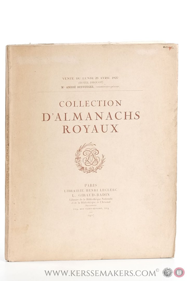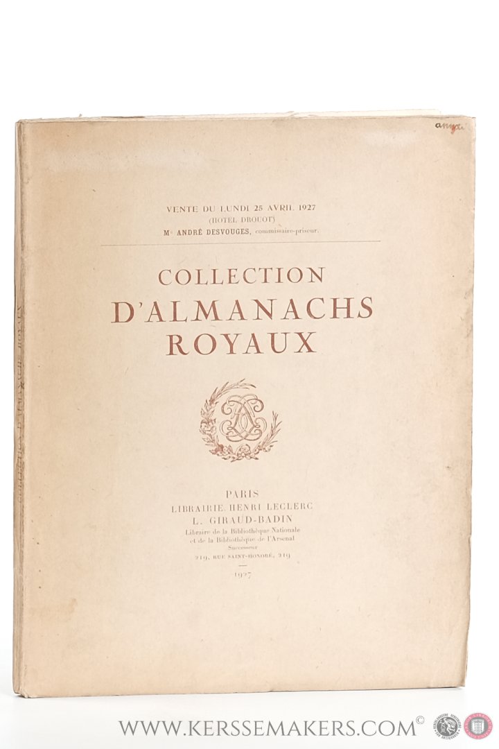 (Catalogue) - Collection d'almanachs royaux. Vente du lundi 25 avril 1927 (Hotel Drouot), Me André Desvougues, commissaire-priseur (Catalogue) - Collection d'almanachs royaux. Vente du lundi 25 avril 1927 (Hotel Drouot), Me André Desvougues, commissaire-priseur (Catalogue) - Collection d'almanachs royaux. Vente du lundi 25 avril 1927 (Hotel Drouot), Me André Desvougues, commissaire-priseur