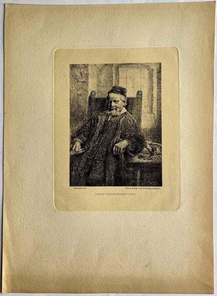| Bijzonderheden: | Portrait of the goldsmith Jan Lutma (1584-1669). Later print after the original by Rembrandt (Rembrand). With the text on the left: Rembrandt, pinx. And on the right Uitg. en Heliogravure J.M. Schalekamp, Buiksloot. |