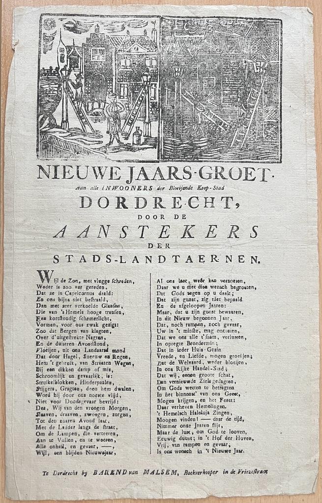| Titel: | New years Wish ca 1800 | Nieuwe jaars-groet Dordrecht door de aanstekers der stads-landtaernen, Barend van Malsem Dordrecht [s.d.], circa 1800, 1 p. In good condition. |
