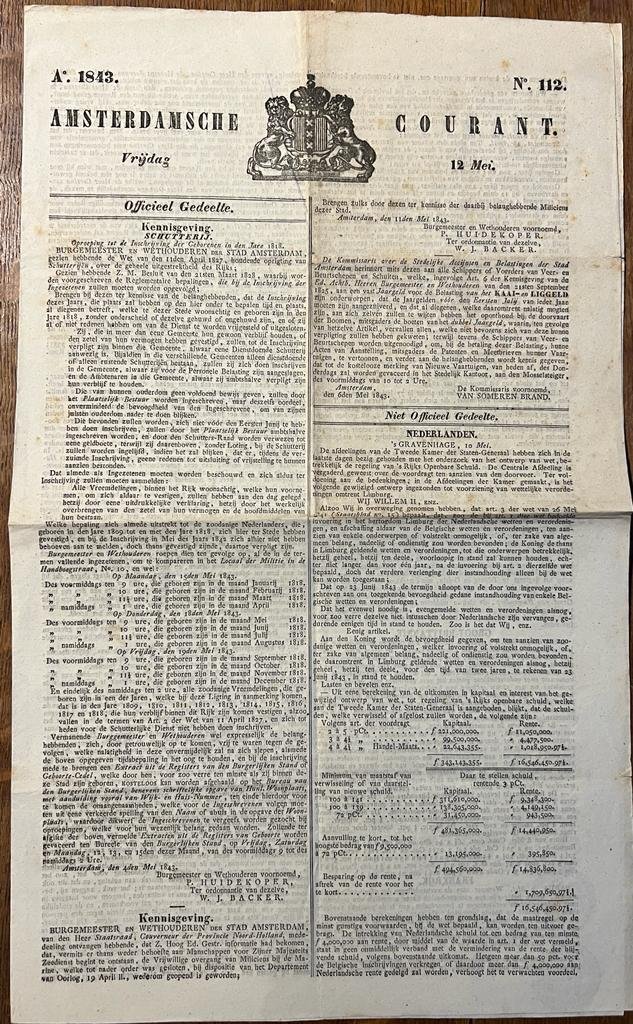 | Titel: | Newspaper Amsterdam 1843 | Amsterdamsche courant vrijdag 12 mei 1843, no 112, J. van Bonga Amsterdam, 4 pp. |