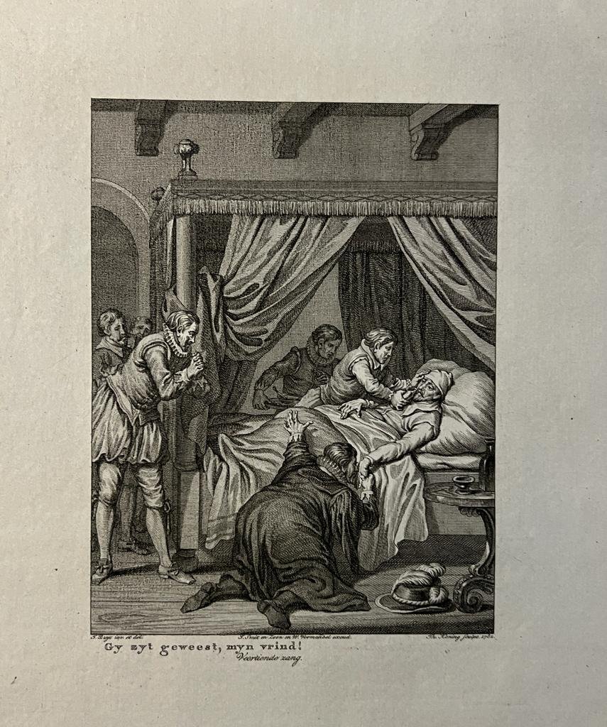 | Titel: | Bookillustration | Ziekbed van de Prins van Oranje 1574, Gy Zyt geweest, myn vrind, History print used in Nomsz, taferelen uit het leven van Prins Willem I, Amsteldam 1782, 1 p. |