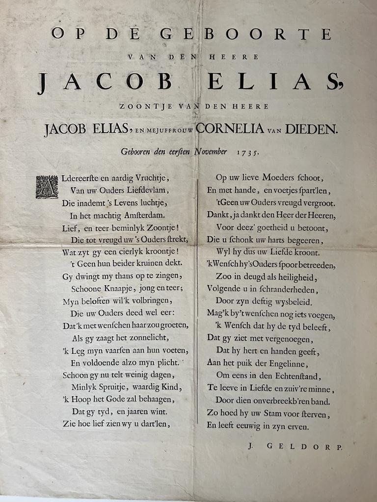 | Titel: | Plano printed publication 1735 | Op de geboorte van den heere Jacob Elias, zoontje van Jacob Elias en mejuffrouw Cornelia van Dieden 1735, 1 p. |