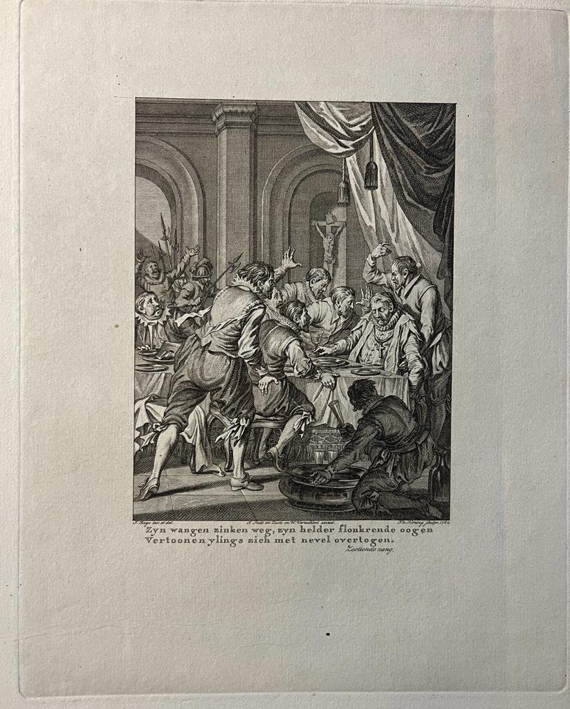 | Bijzonderheden: | Original engraving by Theodoor Koning after Jacobus Buys, dated 1782.[NL] De Spaanse legeraanvoerder en landvoogd van de Nederlanden Requesens sterft onverwacht aan tafel tijdens een banket in Brussel, 5 maart 1576. Om hem heen verschrikte mannen ... |