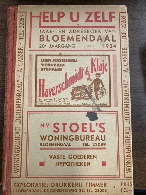 | Meer info: | Help U Zelf / Jaar- en Adresboek van Bloemendaal 20e jaargang = 1934, Exploitatie: Drukkerij T. Timmer - Bloemendaal, 1936, gebonden, 320 pp. eigennamen van buitenplaatsen en huizen; met naam- en adressenlijst van beroepen, etc, etc. In goede staat. |