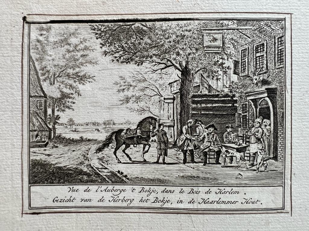 | Bijzonderheden: | Original engraving with text at the bottom: "Vue de l'Auberge 't Bokje, dans le Bois de Harlem", en "Gezicht van de Herberg het Bokje, in de Haarlemmer Hout".Charming view of soldiers and a horse near the inn t Bokje in Haarlem, Zuid Holland, The ... |