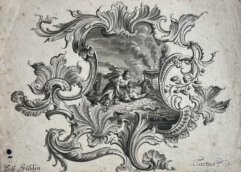 | Titel: | Original engraving 18th century | Ornament print: Tactus (Touch), plate 6 from a set of 6 showing the Five Senses, made by Martin Engelbrecht, 1 p. |