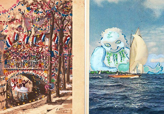 Circa 10 x 15 cm, de meeste gericht aan Rutings moeder en andere familieleden (o.a. de tekenaar Jos Ruting). Sommige dichtbeschreven en vanaf bootreisjes verstuurd, enkele ook gesigneerd door Jan G. Elburg, met wie Lotte Ruting (1910-1998) in de jaren vijftig een verhouding had. Met één latere, onbeschreven kaart waarvan de voorstelling in balpen is aangevuld. Bijgevoegd: een uitnodiging voor een tentoonstelling van Lotte Ruting (1956). Alleraardigste collectie kaarten, alle voorzien van grappige aanvullingen en inkleuringen met pen en gouache, zoals zwemmers, zeemeerminnen, weergoden en feestvlaggen: 14 originele tekeningen dus!