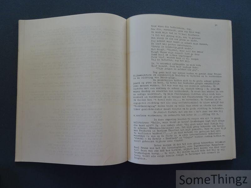 Schaarse publicatie waarin de auteur, afkomstig uit Erembodegem bij Aalst, zijn ervaringen neerschrijft, beginnende bij zijn oproeping bij de algemene mobilisatie op de 13e januari 1940, over de terugtrekking en zijn gevangenname tijdens de Duitse inval in mei 1940 en zijn overplaatsing in krijgsgevangenschap naar Offlag VII B in Eichstätt, tot zijn vrijlating en terugkeer naar Erembodegem in september 1940. Belangrijk ooggetuigenverslag.