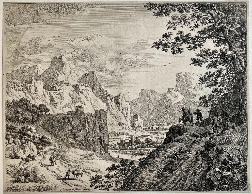 | Bijzonderheden: | Plate 1 and title-page: landscape with at centre a washerwoman doing her laundry in a stream running into the foreground; a peasant riding a donkey approaches from the left; on the right stands a tree; the title is lettered on a rocky outcrop at c... |