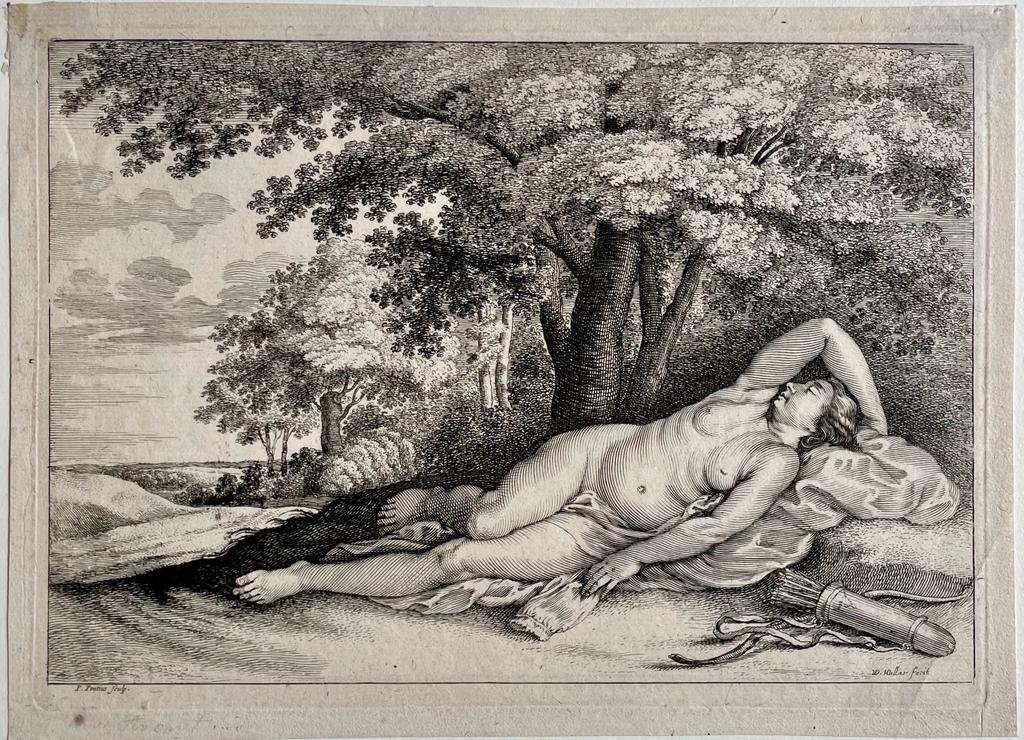 | Titel: | Antique print, etching I Huntress Diana sleeping (Diana goding van de jacht) , published ca. 1644-1652, 1 p. |