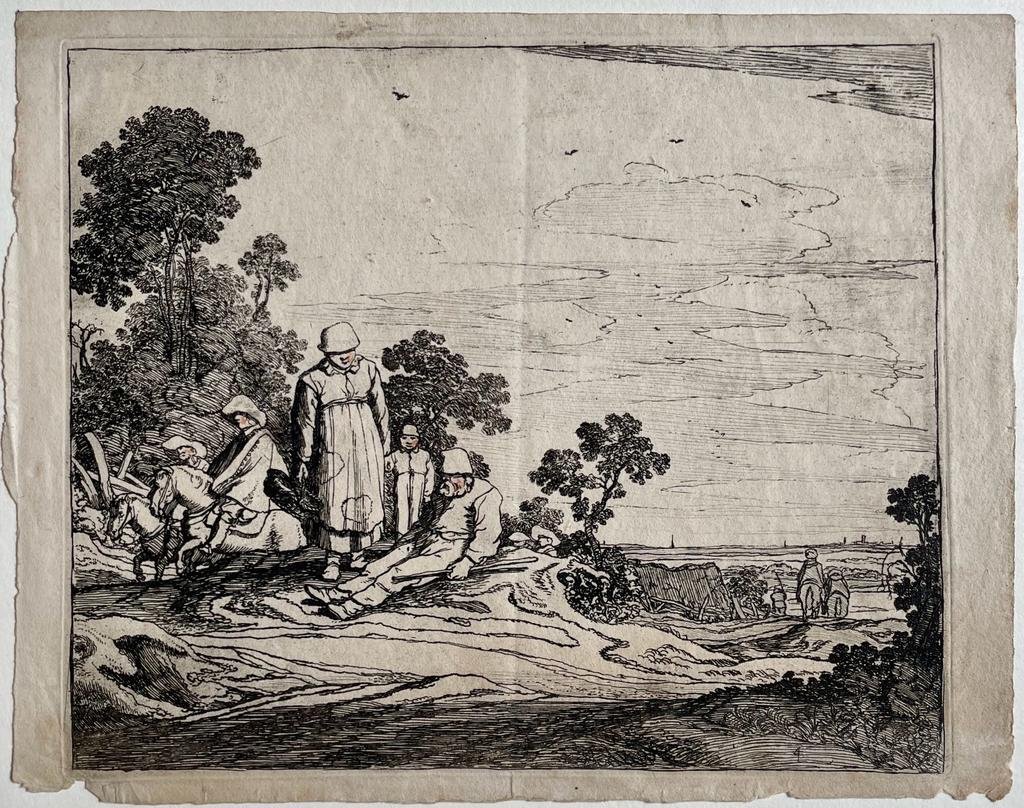 | Bijzonderheden: | Landscape with travellers, including an old man clutching a stick and resting on the ground, an aproned figure stands over him, on the road are a number of horseriders; from a series of four prints showing landscapes with figures.Unsigned plate.Nu... |