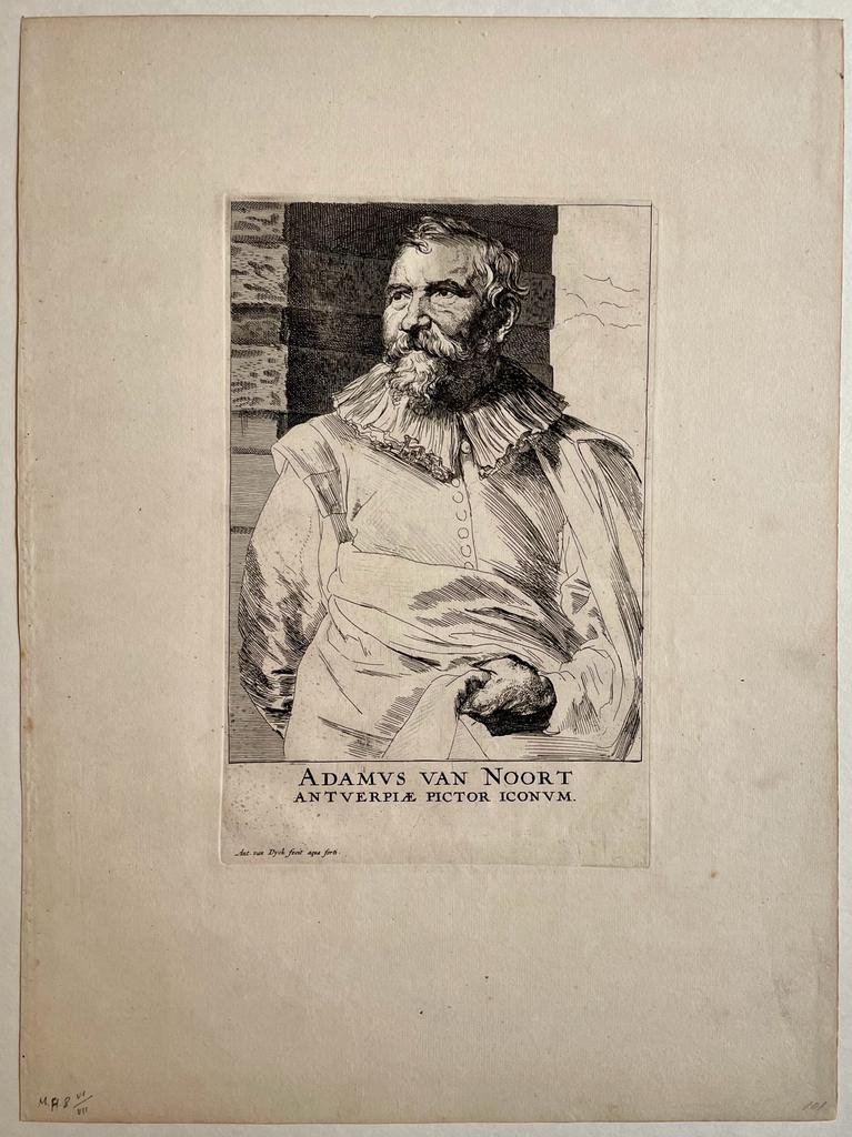 | Bijzonderheden: | Portrait of Adam van Noort, half-length in frontal view but looking towards left, wearing a doublet and ruff, holding his coat with his left hand in front of him; after Anthony van Dyck.Titled at bottom center: Adamvs van Noort / Antverpiæ Pictor... |