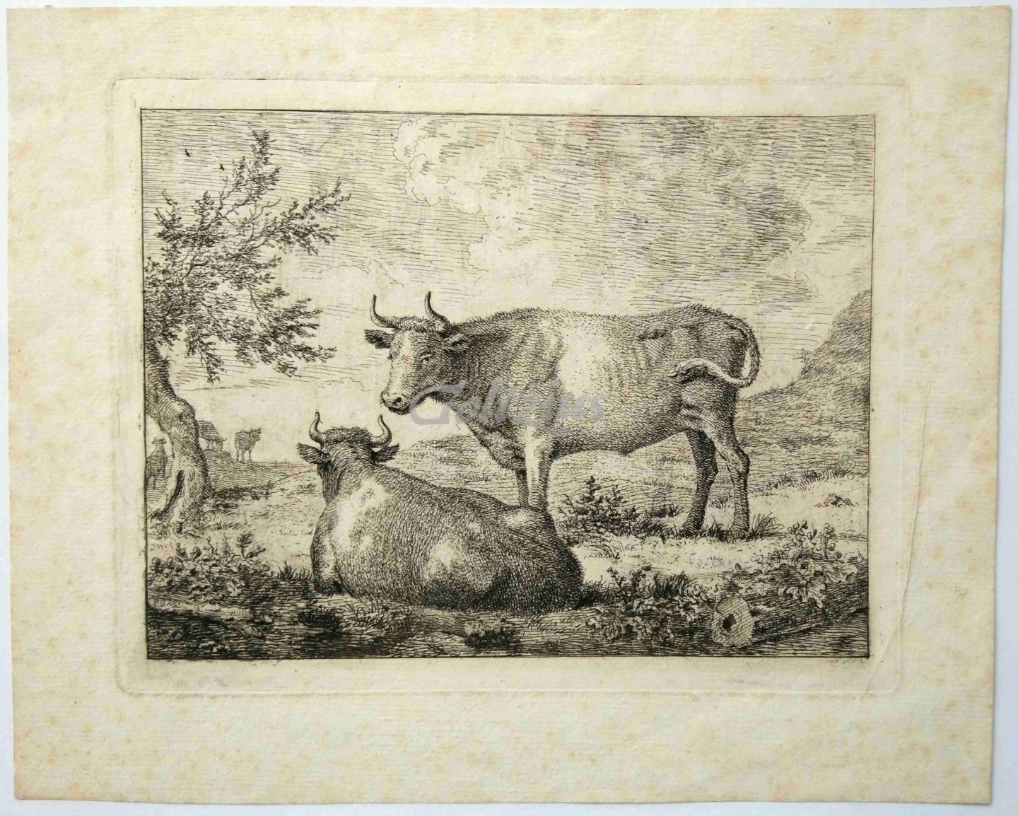 Two cows in a field One cow standing, the other on the grass. A tree to the left, with three more cows in the background. Etching on hand laid paper, made by Gerard van Nijmegen (Rotterdam, 1735 - 1808 Newbury), 1790. Sheet size 234 x 188 mm., platemark 187 x 145 mm. Gerard van Nijmegen was a Dutch painter, draughtsman and etcher in the Romantic style. His etchings are mainly landscapes and animal prints. In good condition, some foxing in the margins, a crease in the lower right (blank area) of the print. With the collection mark of Pim van Eekelen (Lugt 5101) stamped on the verso. References: LeBlanc iii.110: 5-22.