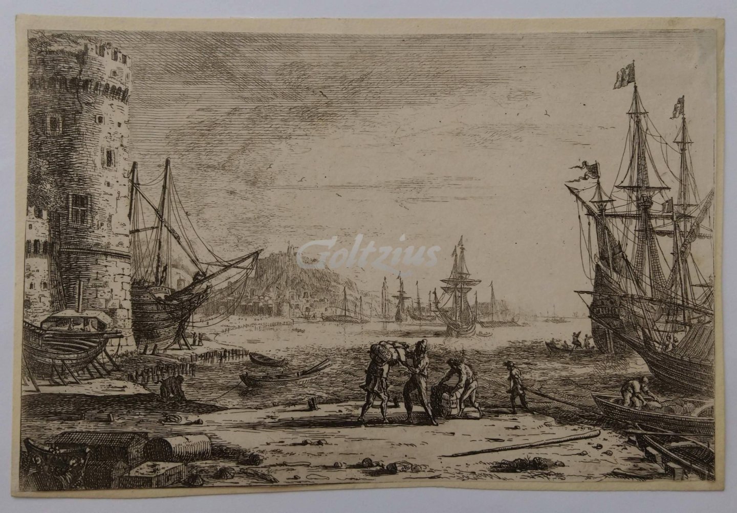 Sea harbour with large tower A few figures are busy unloading a rowboat onto the quay. Several sailing ships in the background. To the left a large round tower, and in the background a hill with fortifications. Etching on thin laid paper, made by Claude Lorrain after his own design, c. 1640 Sheet size 192 x 126 mm. Claude Lorrain (born Claude Gellée, c. 1600-1682) was a French painter, draughtsman and etcher of the Baroque era. In good condition, a nice impression, mounted on a card carrier. Lower right corner with some paper damage. References: LeBlanc 13; Dumesnil i.17: 13; IFF iv.551: 16; Mannocci 238: 39.