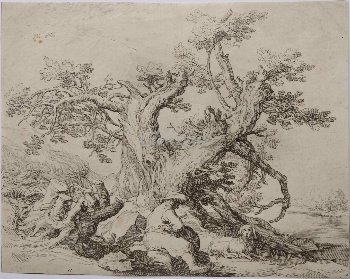 Landscape with gnarled tree A man with his dog is resting underneath a gnarled tree beside a stream. Etching on hand laid paper, made by Frederik Bloemaert after Abraham Bloemaert, c. 1630-1650. Sheet size 206 x 161 mm. Frederik Bloemaert (Utrecht 1614/17-1690 Utrecht) was a Dutch printmaker and draughtsperson, from the famous and prolific Bloemaert family of artists, publishers and printmakers. Abraham Bloemaert (Gorinchem 1566-1651 Utrecht) was a painter, draughtsperson and printmaker, and father of Frederik Bloemaert. In fair condition, cropped within platemark. Creasing in the top left and right corners, some small stains in the top left, edges lightly soiled. References: LeBlanc i.380: 234-248; Hollstein Dutch 95: 298; Roethlisberger 306: 473.