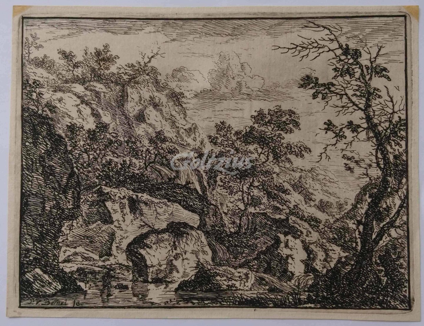 Rocky landscape with pond A rocky forest landscape with a pond in the foreground. Etching on laid paper, made by Peter van Bemmel (1685-1753) and published by H.J. Ostertag (Regensburg). Sheet size 193 x 147 mm., platemark 187 x 140 mm. From a series of six similar landscapes, published in 1716. Peter van Bemmel (Nürnberg 1685-1753 Regensburg) was a German landscape painter and etcher. He was the son of Utrecht-born landscape painter Willem Gerritsz. van Bemmel. In good condition, top left and right margin corners browned, a small stain in the lower left margin corner. References: LeBlanc i.265: 1-6 (i/2, state with the address of Ostertag).