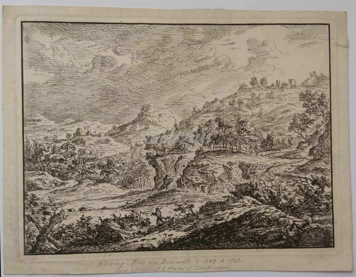 Hilly landscape with a dwelling Hilly landscape with a traveller with a dog in the foreground. Behind the figure a small structure, and some larger buildings in the background. Etching on wove paper, made by Peter van Bemmel (1685-1753). Sheet size 205 x 153 mm., platemark 190 x 139 mm. From a series of six similar landscapes, published in 1716. Peter van Bemmel (Nürnberg 1685-1753 Regensburg) was a German landscape painter and etcher. He was the son of Utrecht-born landscape painter Willem Gerritsz. van Bemmel. In good condition, a small nick in the right margin edge, lower left margin lightly soiled. The collection mark of Pim van Eekelen (Lugt 5101) stamped on the verso. References: LeBlanc i.265: 1-6.