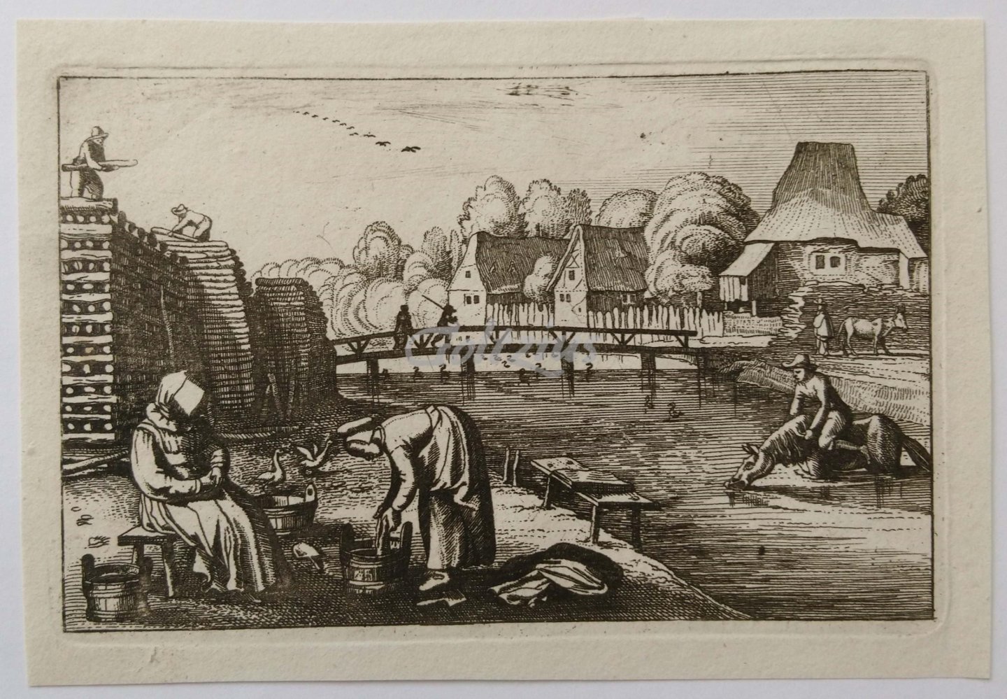 Washerwomen and wood stacking View of a village with a central river. A man waters his horse in the river. To the left two seated washerwomen and behind them two men stacking piles of logs. A bridge leads to a few buildings on the right. Etching on wove paper, by an anonymous etcher in the manner of (or after) Matthaüs Merian (I). From 'Spiegel der natuur en school der teekenkunde', Amsterdam: J.S. van Esveldt-Holtrop, [ca. 1807-1833]. Sheet size 134 x 92 mm., platemark 114 x 80 mm. In very good condition.