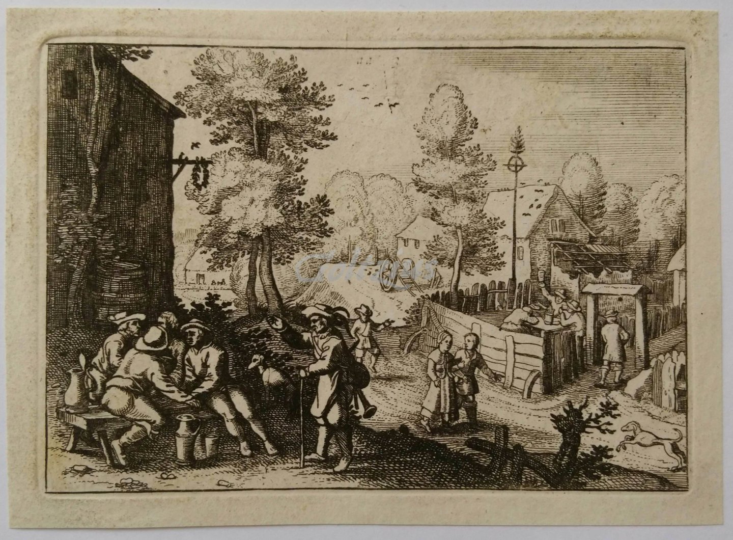 Village view with drinking peasants View of a village with two tables with drinking peasants, on either side of a path. In the foreground a man with bagpipes on his back. Some figures on the path. Etching on wove paper, by an anonymous etcher in the manner of (or after) Matthaüs Merian (I). From 'Spiegel der natuur en school der teekenkunde', Amsterdam: J.S. van Esveldt-Holtrop, [ca. 1807-1833]. Sheet size 127 x 91 mm., platemark 116 x 81 mm. In very good condition.