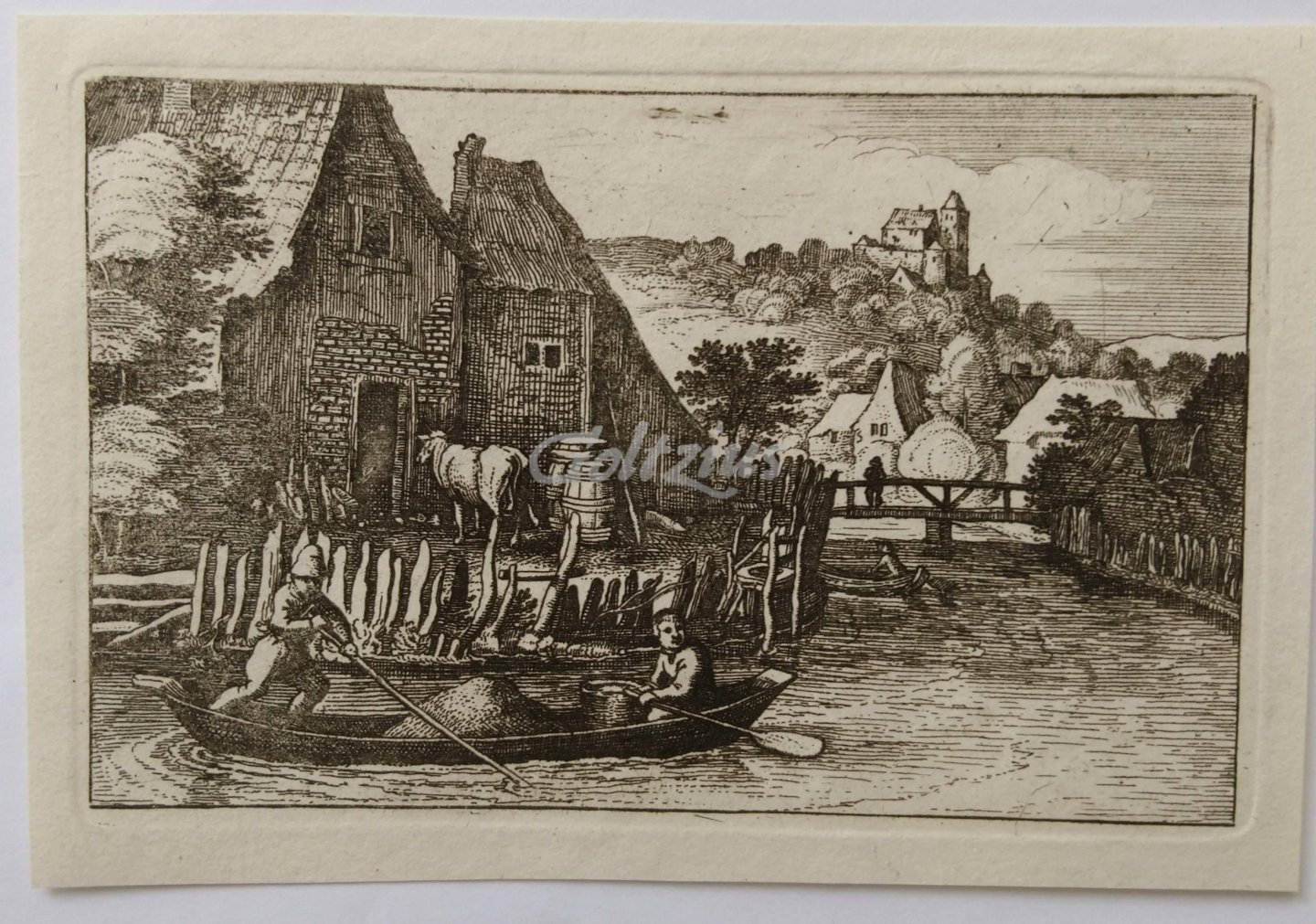 Farmhouse near a canal Two figures in a rowboat on the canal rowing past the farmhouse, with a cow by the door. A bridge crosses the canal, with a figure leaning on it. A castle on a hill in the background. Etching on wove paper, by an anonymous etcher in the manner of (or after) Matthaüs Merian (I). From 'Spiegel der natuur en school der teekenkunde', Amsterdam: J.S. van Esveldt-Holtrop, [ca. 1807-1833]. Sheet size 135 x 91 mm., platemark 125 x 80 mm. In very good condition.