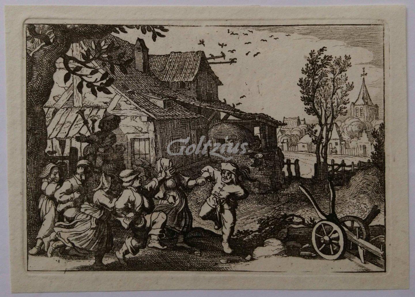 Dancing peasants in a village A group of dancing men and women, accompanier by a bagpipe player, dance outside near an inn. A church and village in the background. Etching on wove paper, by an anonymous etcher in the manner of (or after) Matthaüs Merian (I). From 'Spiegel der natuur en school der teekenkunde', Amsterdam: J.S. van Esveldt-Holtrop, [ca. 1807-1833]. Sheet size 127 x 91 mm., platemark 117 x 81 mm. In very good condition.