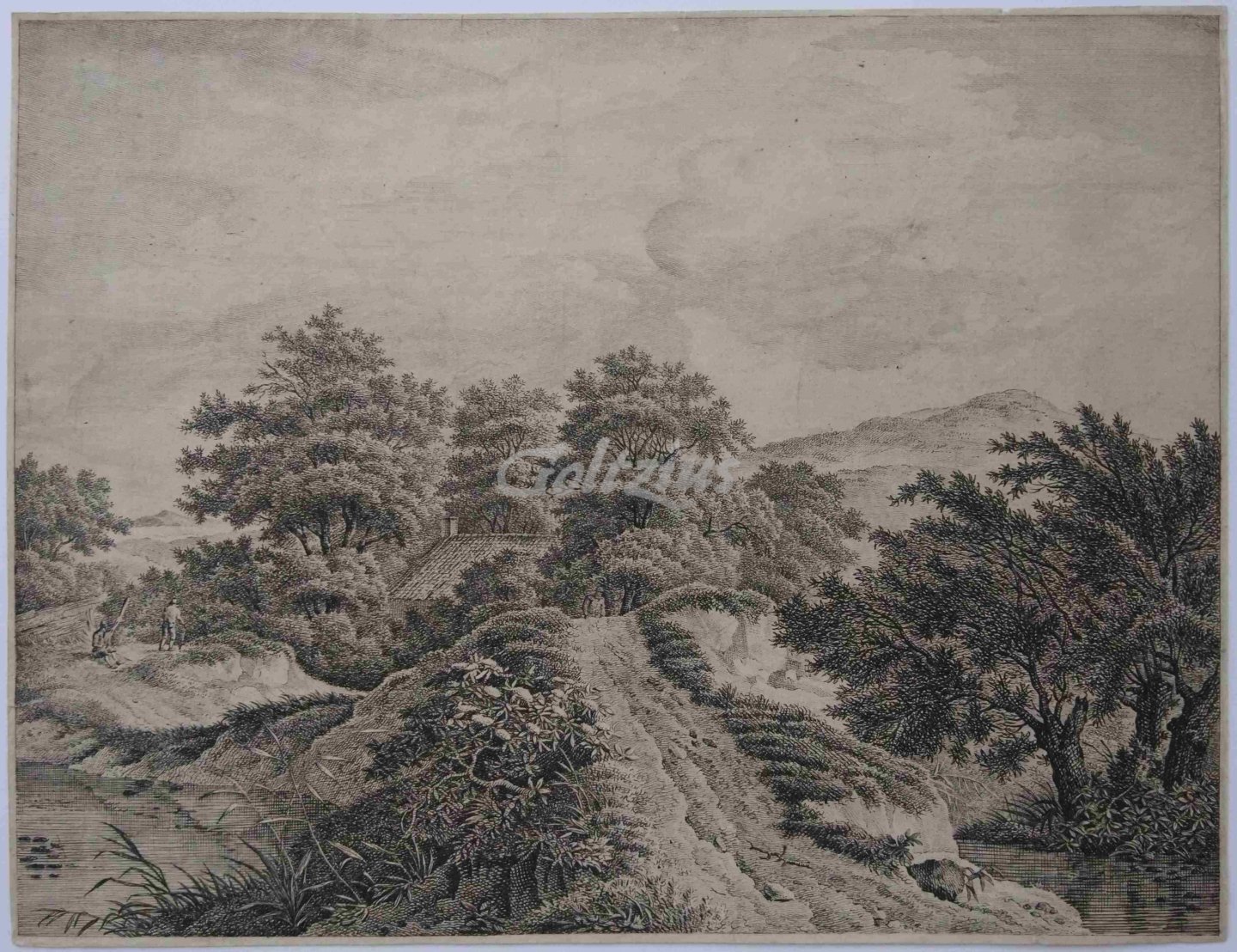 Dune landscape with mostly hidden building A path leads up between two ponds. At the end of the path a tiled roof between the trees. A figure emerges at the end of the path and two more are visible to the left. Etching and engraving on laid paper, made by an anonymous artist, c. 1700-1800. Sheet size 250 x 192 mm. In fair condition, cropped to or over the platemark (no loss of image). A small nick in the top margin, and one in the right margin. Sheet a little browned overall. Some surface soiling and faint creases.