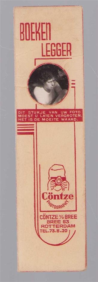 | Bijzonderheden: | c 1950 ??, Zeer goed, Zeer zeldzame boekenlegger van de firma Contzev/d Bree uit Rotterdam. Deze boekenlegger werd gemaakt met o.a een klein stukje van een duur de klant ingeleverde foto met de raad: Dit stukje van uw foto moest u laten vergroten... |