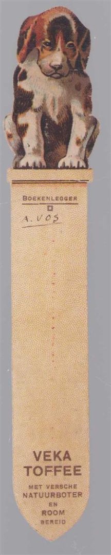 | Bijzonderheden: | c 1930, Zeer goed, Voorzijde: Hondje frontaal - Boekenlegger ( naam handgeschreven) - Veka Toffe met versche natuurboter bereid - Achterzijde Hondje (op de rug gezien) verder blanco. Lithografie. Flexibele boekenlegger - 3,5x18,3 Cm. |