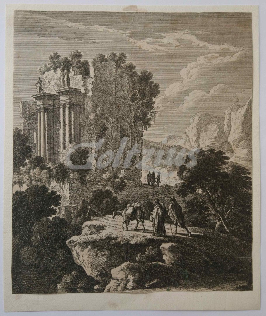 Rocky landscape with ruin and travellers A man and a woman carrying a baby on her back, accompanied by a donkey (possibly the Holy Family), in a mountainous landscape with a ruin. Near the ruin are three additional figures. Etching and engraving on laid paper. Due to cropping, no signatures occur, but this is quite probably a print made by one of the Perelle family members of French printmakers: Nicolas, Gabriel or Adam. Sheet size 173 x 203 mm. Undated, 17th century. In good condition, cropped within the platemark, attached to laid paper carrier. Some surface soiling in the lower left shadows. With the collection mark of Pim van Eekelen (Lugt 5101) stamped on the verso of the carrier.