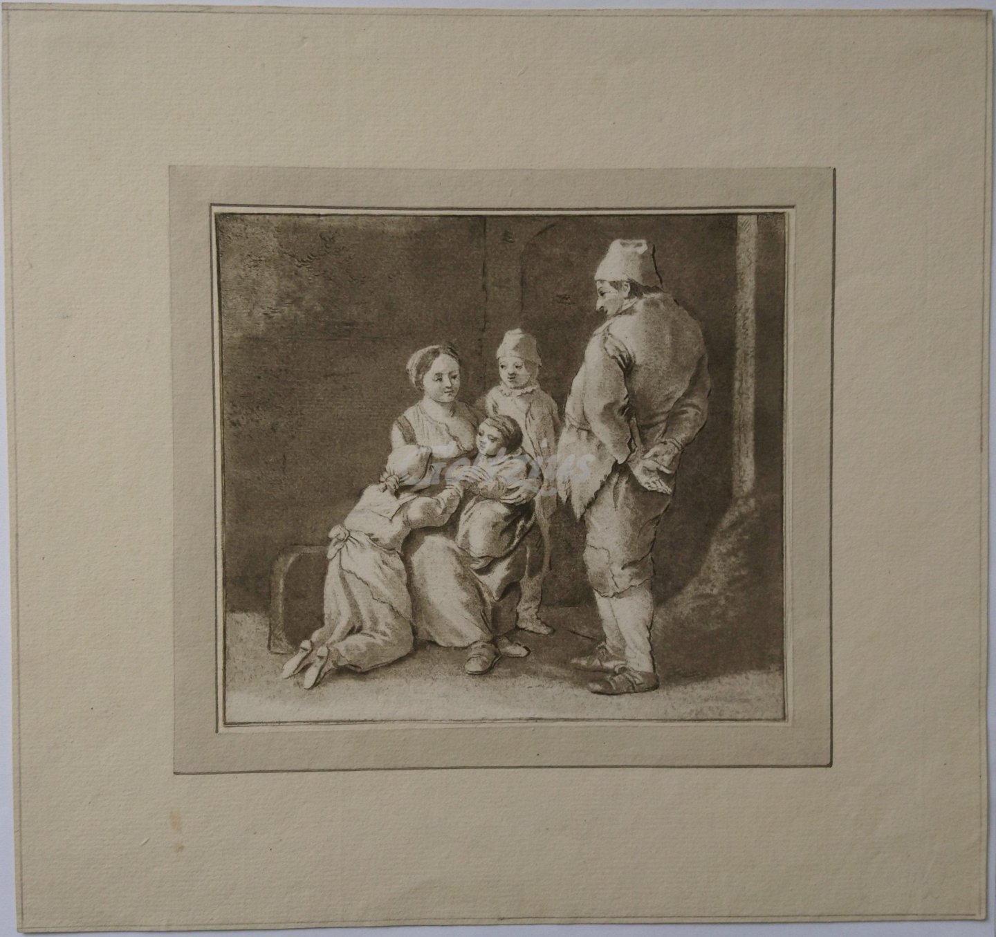 Interior with family A man stands, with his hand on his back, looking down at his seated wife, who is surrounded by three children. Printdrawing on laid paper, by Cornelis van Noorde after Johannes Lingelbach, 1767. Sheet size 166 x 150 mm., carrier size 285 x 268 mm. Printdrawing is a graphic technique that resembles drawing, and uses combinations of etching, roulette, stipple engraving, and aquatint to accomplish this. Cornelis Ploos van Amstel was an avid collector of Dutch drawings, and is credited with inventing the technique of printdrawing. Cornelis van Noorde (Haarlem 1731 - 1795 Amsterdam) was a Dutch landscape painter and printmaker. He is one of the founders of the Haarlemse Teekenacademie (Haarlem Academy of Drawing). Johannes Lingelbach (Frankfurt am Main 1622 - 1674 Amsterdam) was een German-born Dutch painter. His work is often associated with that of Philip Wouwerman, the famous horse and battle painter. In excellent condition, on the original carrier sheet, presented in the much the same way as the printdrawings issued by Ploos van Amstel. An annotation in ink in a contemporary hand on the verso gives details of the artists involved.