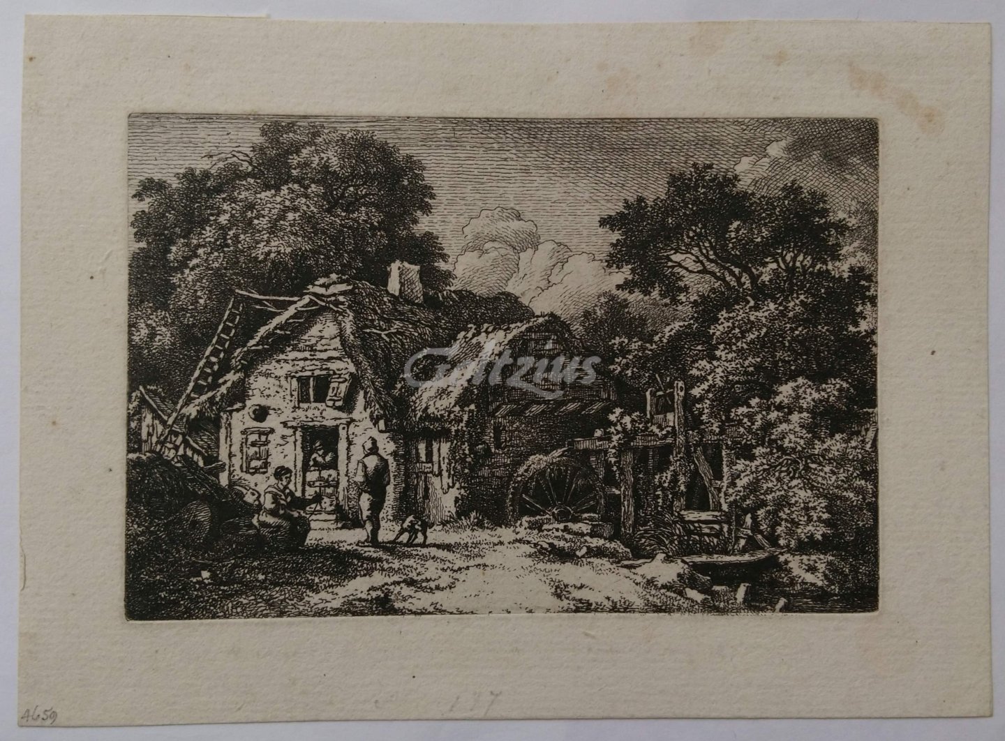 A woman and two men in conversation A man leans on the lower half of the double door to a farmhouse with waterwheel. A man with his dog stands outside the farmhouse, while a woman sits nearby with a spindle. Etching on laid paper, made by Ferdinand Kobell after his own design. Sheet size 169 x 123 mm., platemark 132 x 88 mm., c. 1780 Ferdinand Kobell (Mannheim 1740 - 1799, Munich) was a German painter and printmaker. In very good condition, some stains in the top margin (not affecting image). An unidentified collection mark (Lugt 2644: monogramme WPL) stamped on the verso.