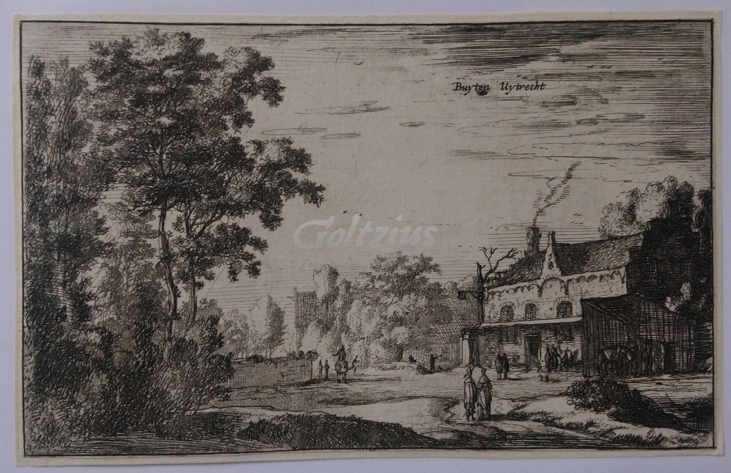 Buyten Uytrecht View outside of Utrecht, of a building with a man and woman in the foreground, from a series of eight etchings depicting landscapes in the provinces around Amsterdam. Etching on laid paper, made by Roelant Roghman, c. 1660. Sheet size 205 x 128 mm. In very good condition, cropped within platemark, attached to carrier sheet. Rare print. References: Hollstein 11 (ii/2); Dutuit 11; Wurzbach 11.