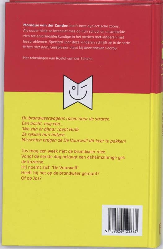 Monique van der Zanden heeft twee dyslectische zoons. Als ouder hielp ze intensief mee op hun school en ontwikkelde zich tot ervaringsdeskundige in het werken met kinderen met leesproblemen. Speciaal voor deze kinderen schrijft ze in de serie Ik ben niet bom! Leesplezier staat bij deze boeken voorop.Met tekeningen van Roelof van der Schans.De brandweerwagens razen door de straten.Een bocht, nog een...'We zijn er bijna,' roept Huib.Ze rekken hun hals. Misschien krijgen ze dit keer de Vuurwolf te pakken!Jos mag een week met de brandweer mee.Vanaf de eerste dag belaagt een geheimzinnige gek de kazerne.Hij noemt zich 'De Vuurwolf'.Heeft hij het op de brandweer gemunt?Of op Jos?