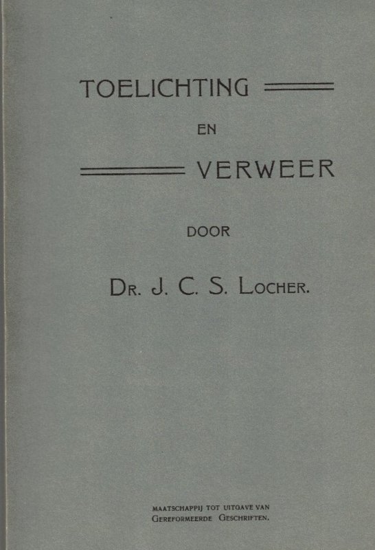 Toelichting en verweer, opmerkingen aangaande verschillende punten der waarheid door dr. J.C.S. Locher, predikant bij de Ned. Herv. Gemeente te Waspik. Naaer aanleiding van de dissertatie van dr. J. van Lonkhuijzen 'Hermann Friedrich Kohlbrugge en zijn prediking'. |