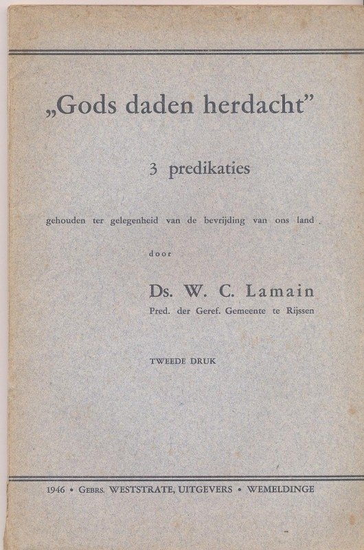 Gods daden herdacht, drie predikaties t.g.v. de bevrijding van ons land door ds. W.C. Lamain, Predikant der Gereformeerde Gemeente te Rijssen. De preken gaan over Jesaja 17:14, 2 Kronieken 29:10 en 1 Koningen 8:56-58. |