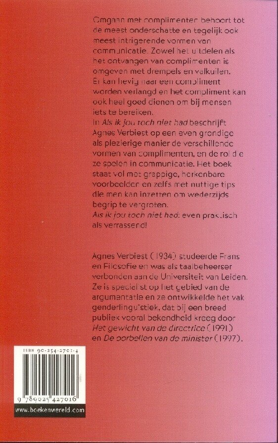 Omgaan met complimenten behoort tot de meest onderschatte en tegelijk ook meest intrigerende vormen van communicatie. Zowel het uitdelen als het ontvangen van complimenten is omgeven met drempels en valkuilen. Er kan hevig naar een compliment worden verlangd en het compliment kan ook heel goed dienen om bij mensen iets te bereiken. In Als ik jou toch niet had beschrijft Agnes Verbiest op een grondige maar erg plezierige manier (ja, dank u) de verschillende vormen van complimenten, en de rol die ze spelen in communicatie. Het boek staat vol met grappige, herkenbare voorbeelden en zelfs met nuttige tips die men kan inzetten om wederzijds begrip te vergroten. Als ik jou toch niet had: even praktisch als verrassend!