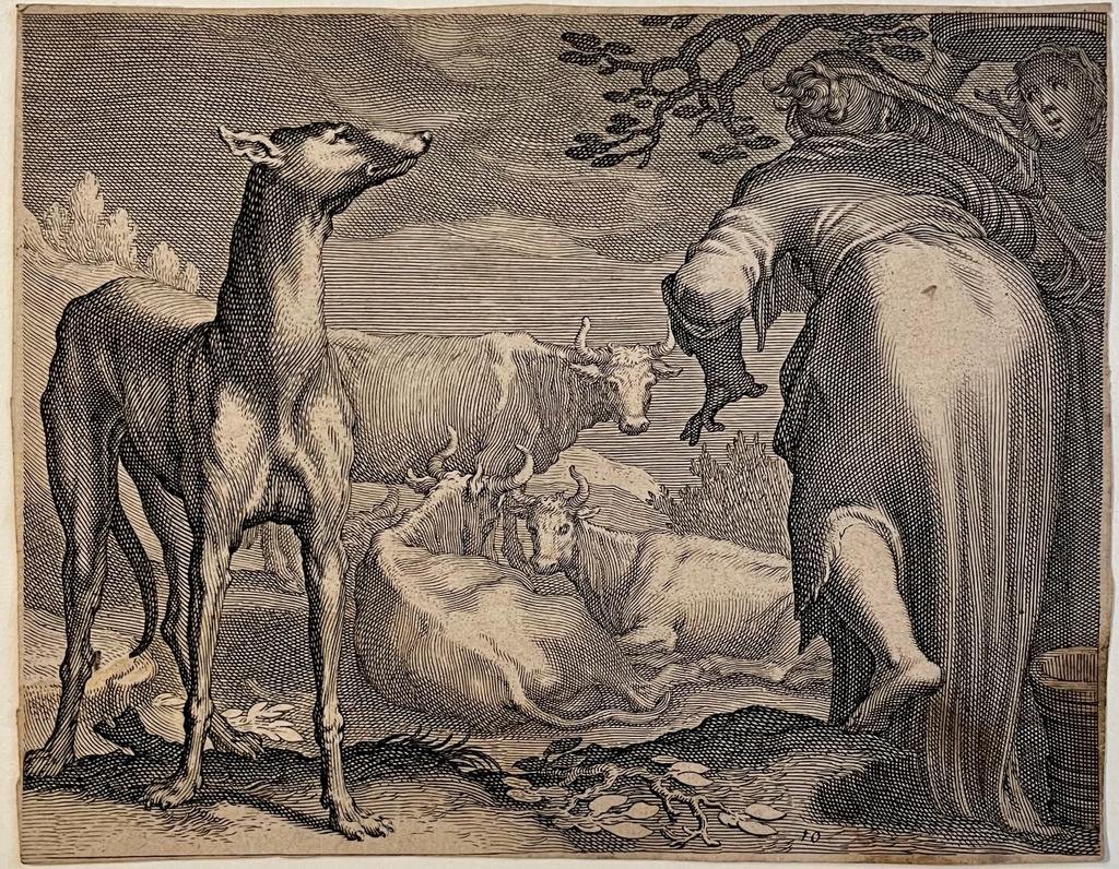 | Titel: | Antique print, engraving | Two women and dog near cows, published 1611, 1 p. |