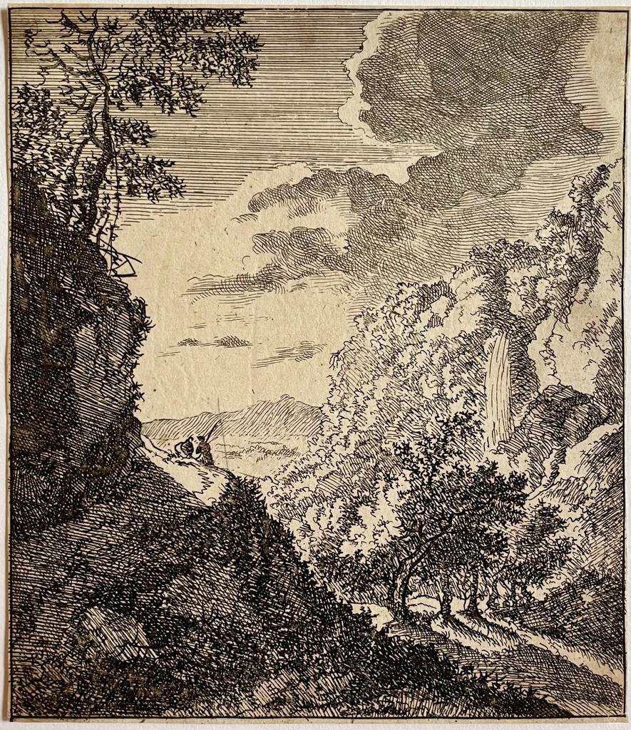 | Bijzonderheden: | Landscape with two travellers in conversation on a road in the lower left corner, a valley with trees in the centre, a waterfall on the mountain at right; from a series of four plates showing landscapes after Both.[NL] Berglandschap met twee zitte... |