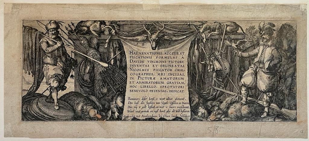 | Titel: | Antique print, etching and engraving | Frontispiece Hunting Scenes, published 1612, 1 p. |