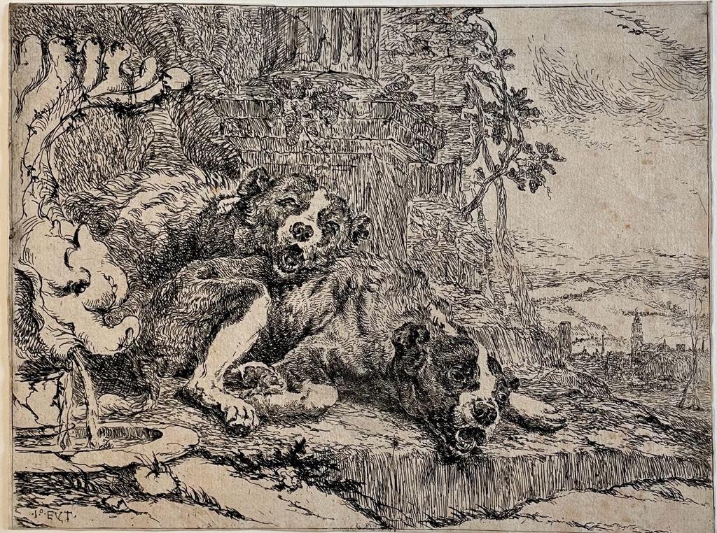 | Bijzonderheden: | Two dogs sleeping over each other next to a fountain in a dolphin shape to the left, the base of a column behind the dogs, a town in the background to the right.Seventh plate in a series of prints showing dogs.Signed on the rock on the bottom left... |